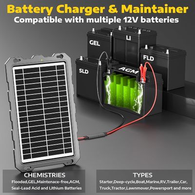 [종합적인 배터리 보호] 단면 태양 전지 패널 태양 자동차 배터리 누출 충전기는 배터리를 완전히 보호합니다. 누출 충전을 사용하여 과부하를 일으키지 않고 배터리를 충전합니다.내장 된 차단 다이오드는 밤에 추가 유지 보수 없이 역 충전을 방지합니다.구름이 있는 날에도 작동합니다. 업그레이드된 지능형 충전기 컨트롤러와 함께, 태양 스프링 충전기는 역 충전, 과충전, 과전압, 또는 단전으로부터 배터리를 보호합니다.